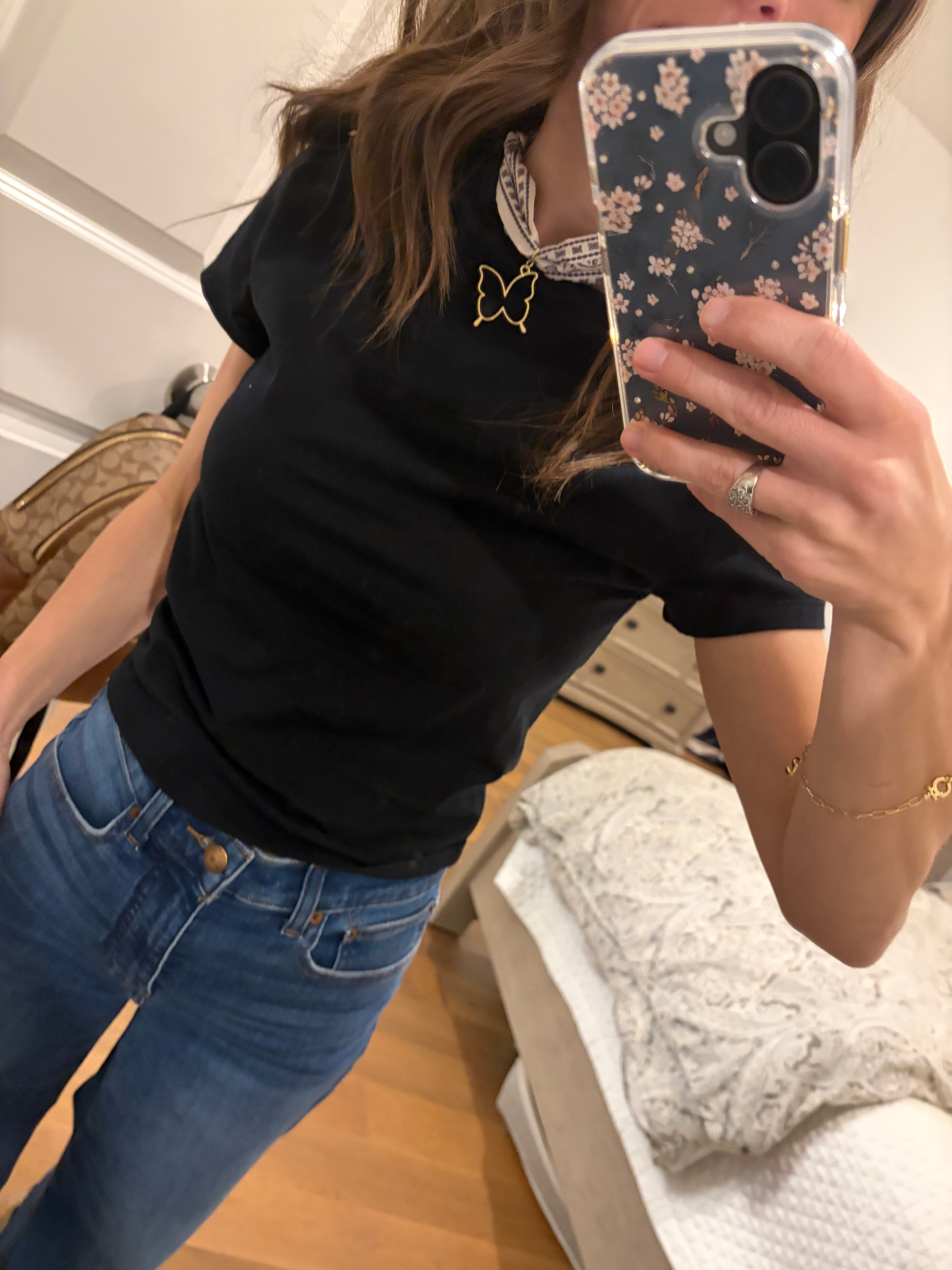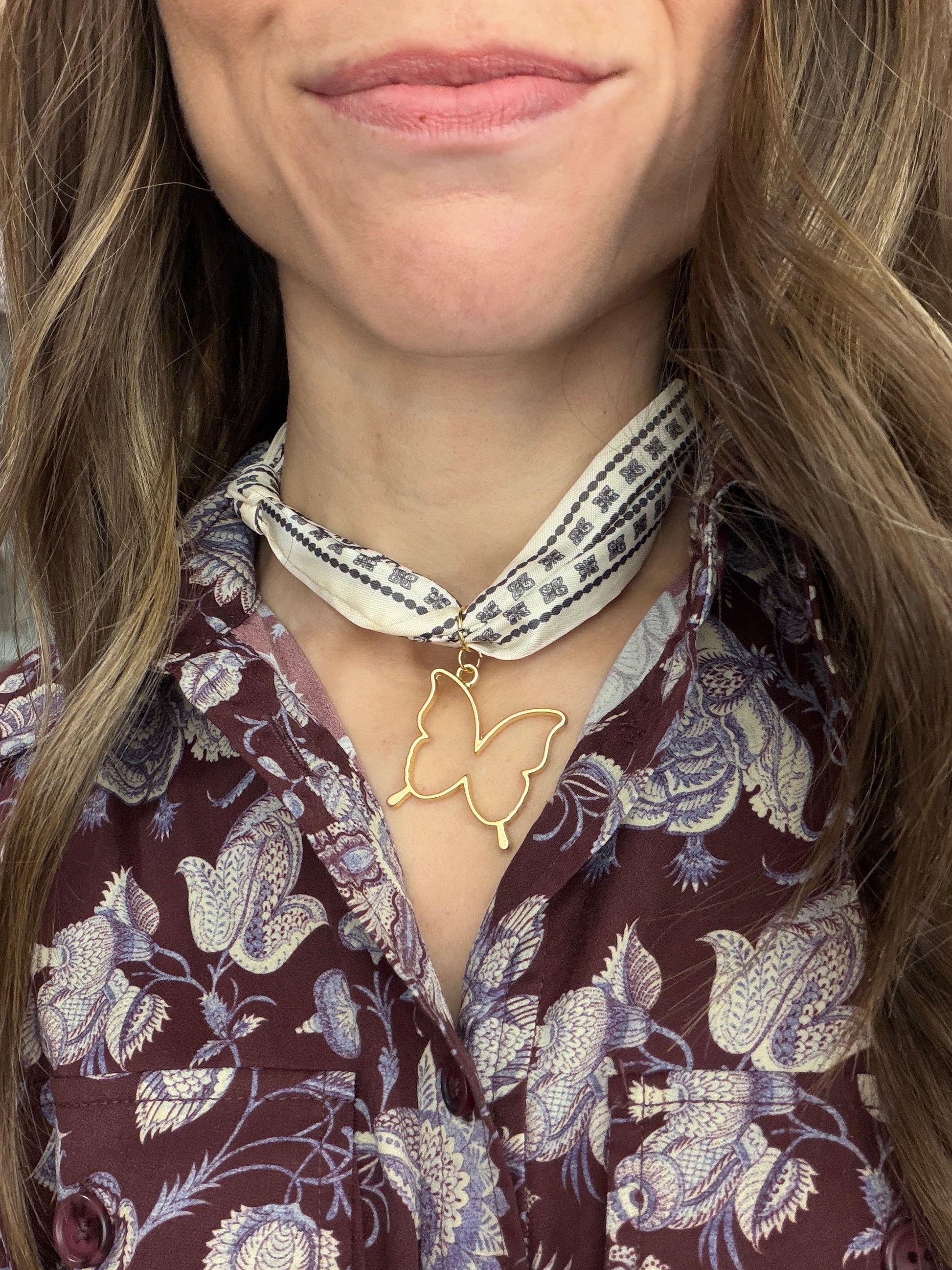 White silk bandana with gold butterfly pendant.